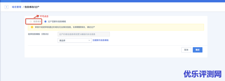 当域名状态是“实名认证中”或“已实名认证”,点击[信息修改/过户],用户仅能做过户操作,即把域名过户至已实名的信息模板。涉及信息模板的操作请参考域名信息模板管理
