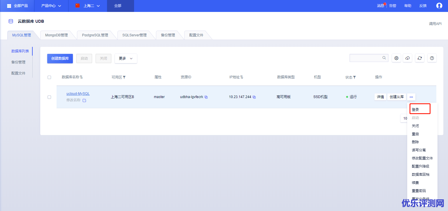 在控制台UDB-MySQL管理页面,选择需要登录的MySQL数据库实例,点击操作项中的登录: