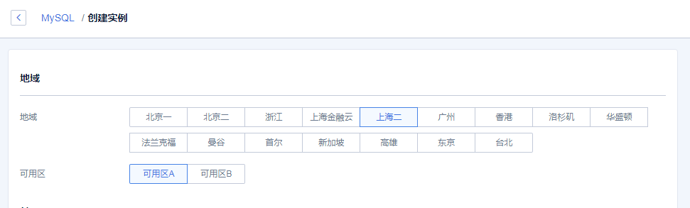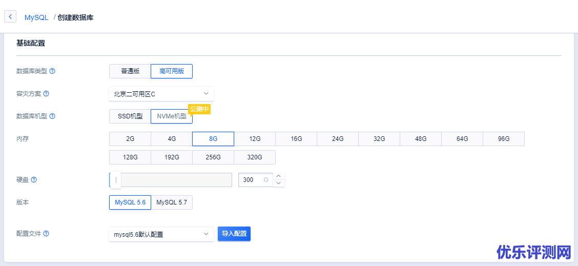 3.1)按需选择实例类型(高可用版)、版本、数据库机型、内存、硬盘、高可用容灾方案。创建MySQL实例时会使用默认配置文件,若有特殊需要,用户可以上传自定义配置文件。