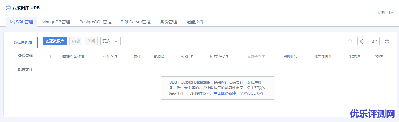 1、在控制台选择云数据库UDB>MySQL管理,点击“创建数据库”;或者在空白区域根据提示点击创建MySQL实例。