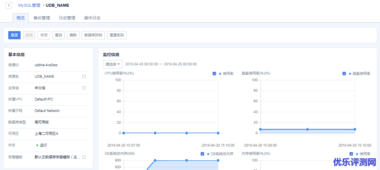 6、选择某一个MySQL实例点击“详情”会显示MySQL实例详细信息,同时可以查看监控数据和进行常用操作。