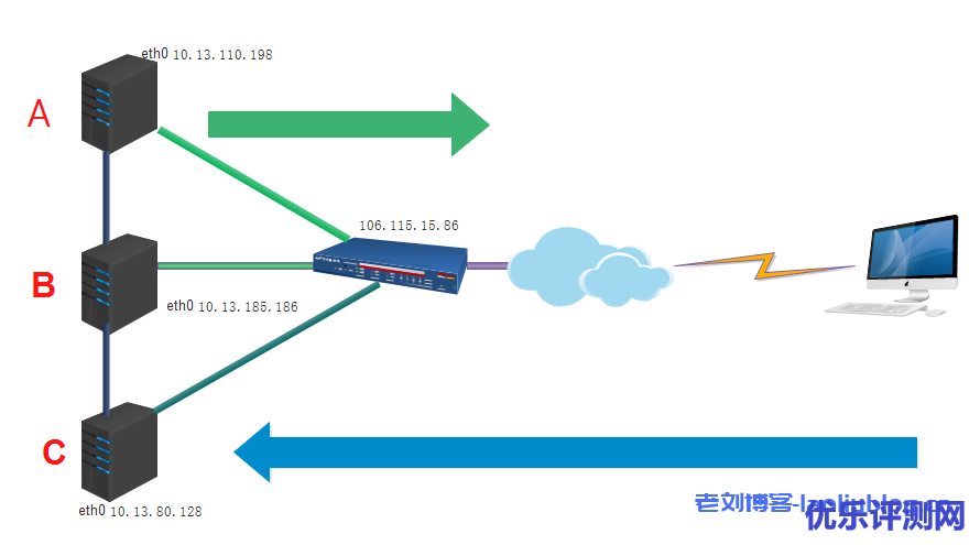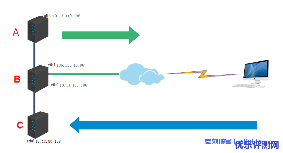 此时,A和C机器都能连通互联网了。图中最上面的绿色箭头已通。但是,外网用户若要访问C机器,要怎么办呢?若C机器提供web服务,那好说,直接在B机器上装nginx做反向代理,若想从外网直接ssh登录C机器呢,现在我们解决图中最下面的蓝色箭头。