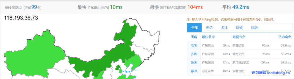 老刘使用站长工具Ping测试分别对通用型和快杰型云主机进行了测试以下是测试结果图: