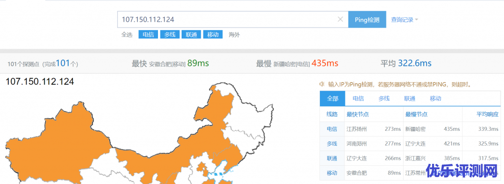 Ping测试国内三网连通性,可以看到最快合肥节点延时89ms,最慢新疆哈密435ms,平均延时322.6ms。整体来说不建议客户在国内的朋友们采购该机器,连通性不是太好。