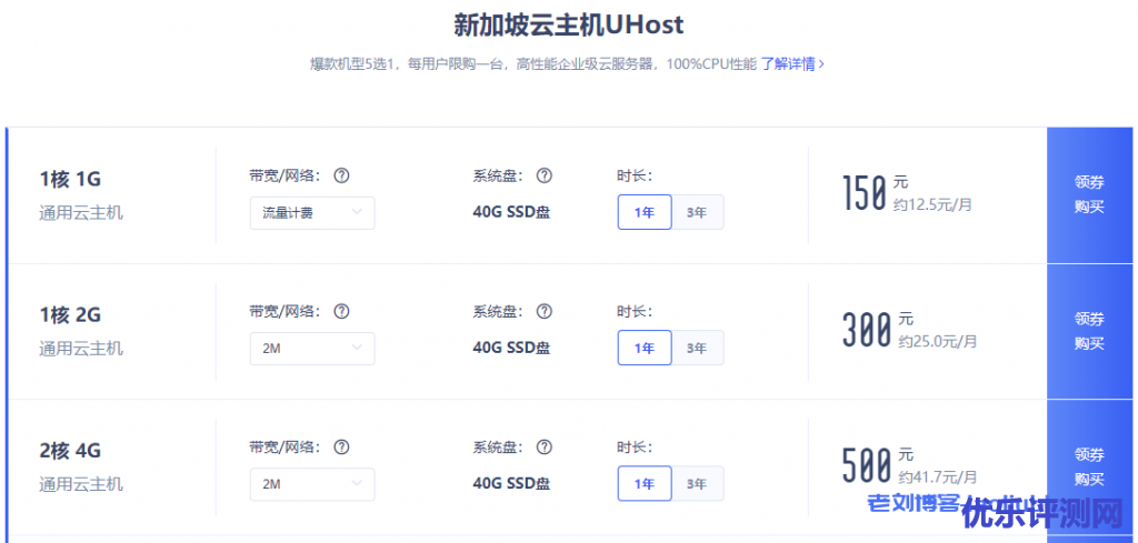 免备案的海外服务器除了中国香港和美国服务器云主机,新加坡服务器vps还是很受欢迎的。看到UCloud优刻得官网针对海外云主机的促销活动vps:1核2G内存2M带宽40G系统盘配置云主机首年300元3年800元,老刘博客这里以新加坡云主机vps作为测评对象,供朋友们采购参考。