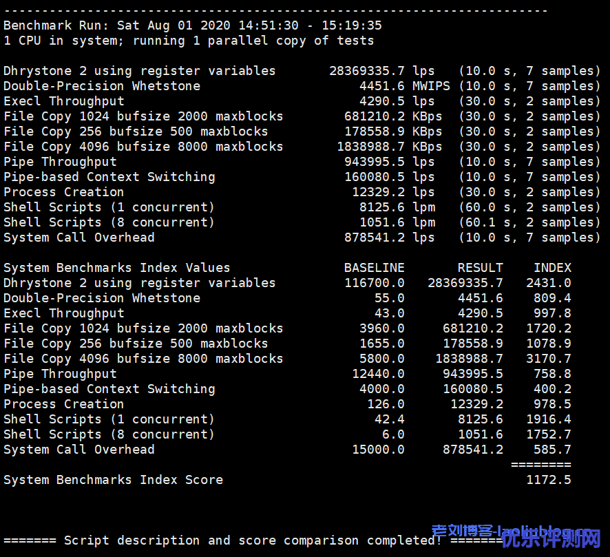 UnixBench测试了系统调用、读写、进程、图形化测试、2D、3D、管道、运算、C库等性能,是一个比较综合性测评机器性能的工具,这里具体各个性能数据不用作分析,这里我们只需要看最后的跑分结果。得分小于400的性能比较差、500-1000正常、大于1000优秀、大于2000极好。当然跑分不是认定机器好坏的唯一标准,需要综合考虑。此次跑分为1172.5>1000,机器性能优秀。