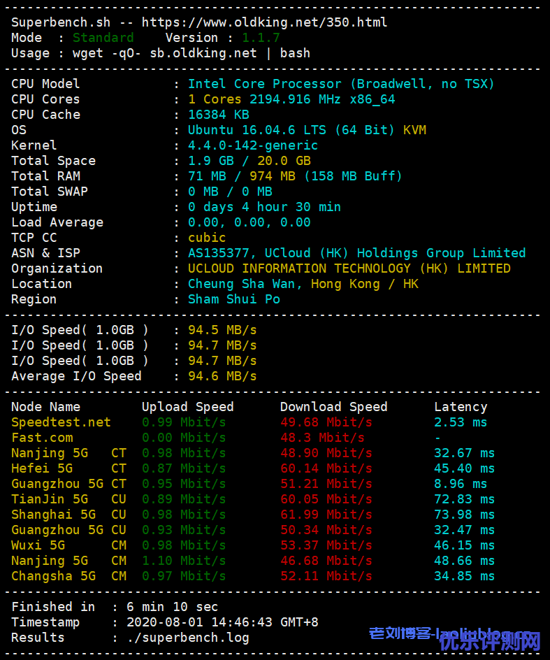 UCloud云主机怎么样?前文《首年150元1C1G1M优刻得香港快杰云主机性能评测》,老刘博客有针对UCloud优刻得近期推出的促销香港快杰云主机进行了机器评测,现在采用同样方法,老刘这里对同配置1核1G内存1M BGP带宽的香港通用型云主机vps进行评测,有兴趣的朋友们也可以翻阅前文进行两种机型的评测对比,选购适合自己的机器。