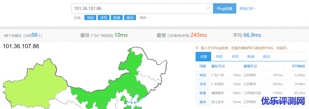 Ping测试国内三网连通性,可以看到最快广州节点延时10ms,最慢江苏泰州243ms,平均延时66.9ms。对有免备案需求,用户又在国内的朋友们,采购该机器很适合。
