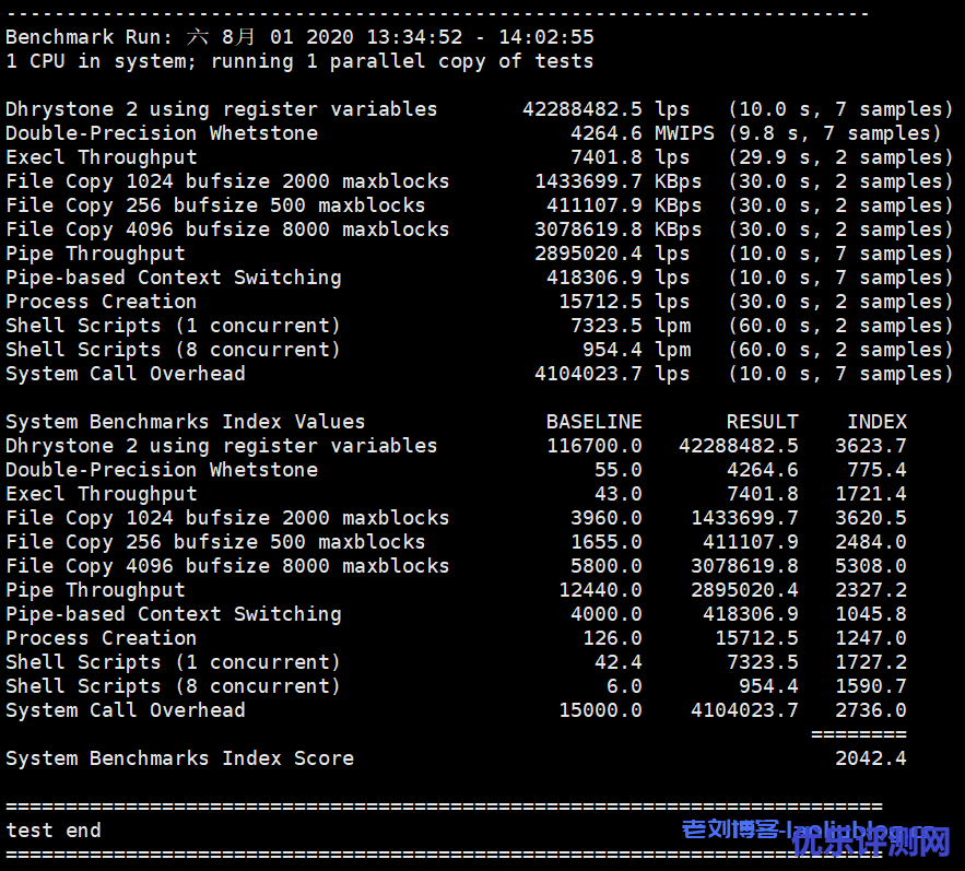 UnixBench脚本可以综合测评云主机综合性能,测试完成会给出一个分值,该分值越高越好。得分小于400的性能比较差、500-1000正常、大于1000优秀、大于2000极好。当然跑分不是认定机器好坏的唯一标准,需要综合考虑。下图可知,1核1G内存2M BGP带宽线路快杰云主机最后跑分分值2042.4>2000,性能可谓极好。