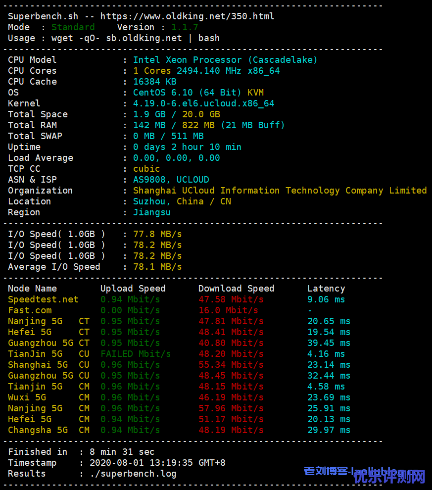 SuperBench脚本,可以一键测试云主机服务器VPS各种性能,包括机器基本信息,硬盘读写速度,到国内各个地区的下载速度等。由下图可知,机器参数符合UCloud机器说明,硬盘读写速度平均78.1MB/s,到国内各地区上传和下载速度均达到了官方该配置的限定速度1MB/s和50MB/s,同时延时较低,真正的超低延时。