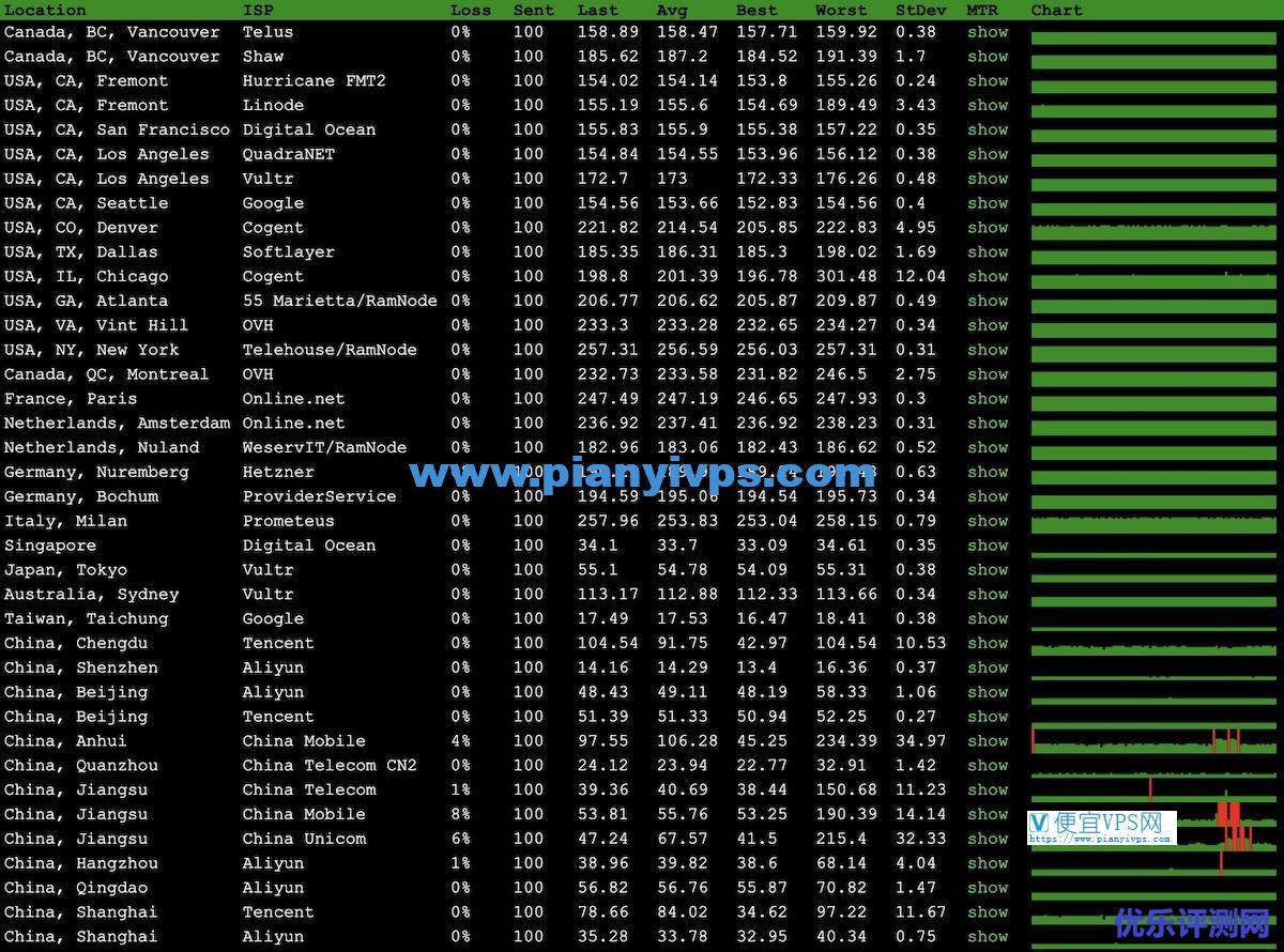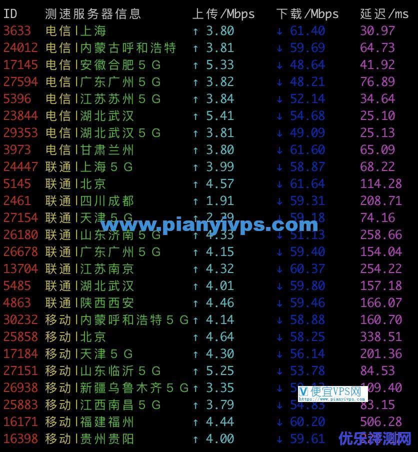 | 东北地区 | 11 | 辽宁大连(电信)60.6毫秒 | 辽宁沈阳(联通)104.6毫秒 | 71.7毫秒 |