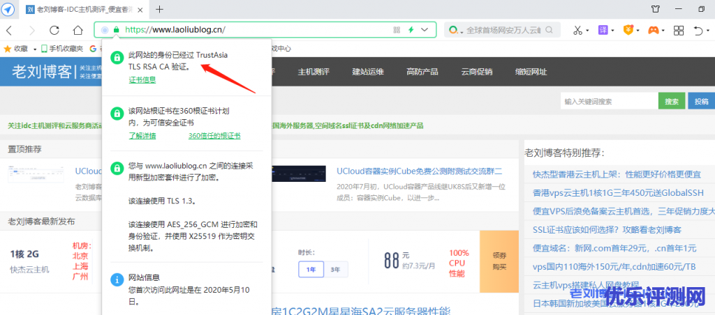3,清除360浏览器缓存,再次访问老刘博客网站,看到站点已经是?https开头的了,显示“此网站的身份已经过TrustAsia TLS RSA CA验证”。