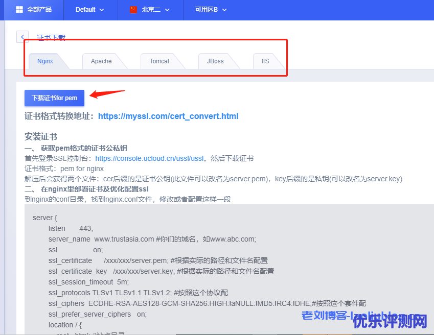 由于老刘博客web服务器是Nginx,同时网站是通过宝塔面板搭建的,这里仅演示Nginx服务器通过宝塔面板部署安装UCloud优刻得免费SSL证书的流程,其他架构可以参看UCloud官网文档。(网站通过建站公司搭建的,后期去建站公司给你的管理后台上传证书部署即可,比如凡科建站)