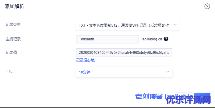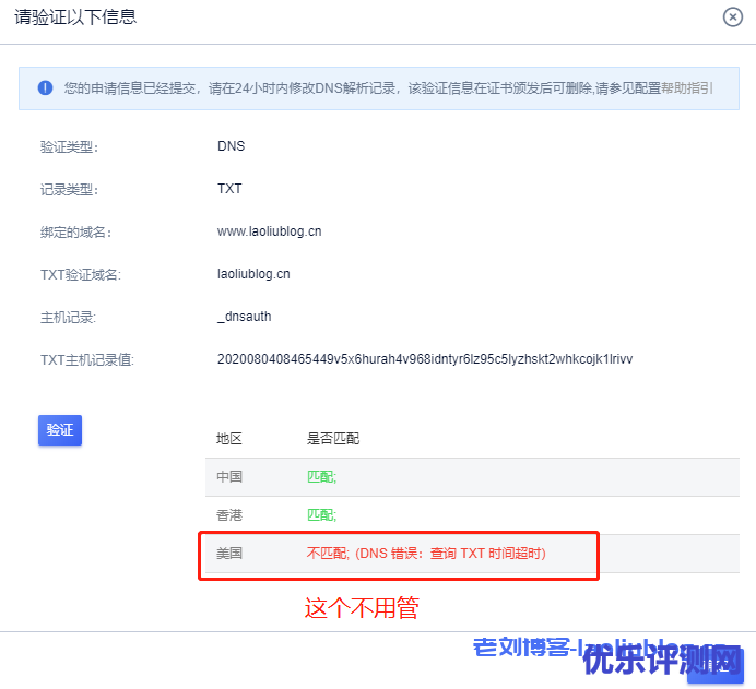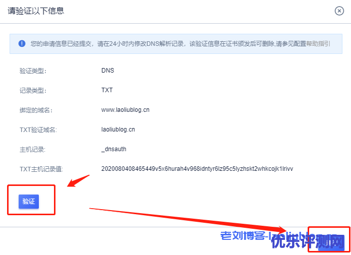 5,补全信息完成提交后,拿到DNS验证信息到域名管理进行域名dns解析,解析之后选择验证,[验证]成功后,点选[确定]按钮。