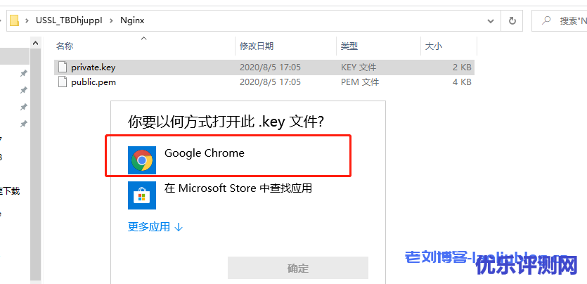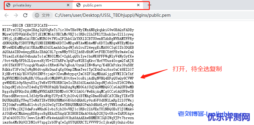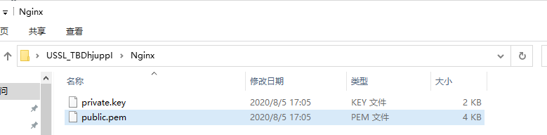 1,依照上图点选[下载证书for pem]按钮,下载压缩包并解压,找到解压文件夹Nginx里的private.key和public.pem文件。分别双击选择浏览器打开这两个文件。
