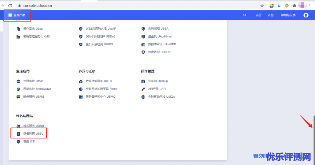 2,登录成功后,选择全部产品,页面拨到最下面,找到[域名与网站],点选[证书管理USSL]。