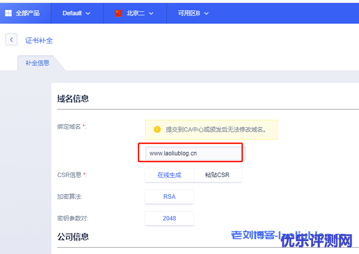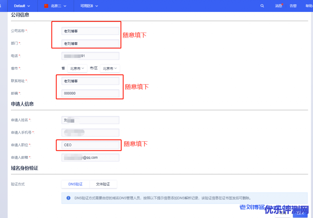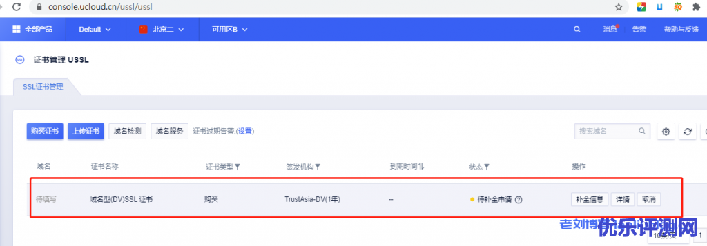 4,购买完成后返回证书管理USSL界面https://console.ucloud.cn/ussl/ussl,这时就显示出了刚才购买的免费SSL证书了。随后点选[补全信息]按钮,填充域名信息,补充申请人信息和选择域名身份验证方式,这里老刘选择了DNS验证。