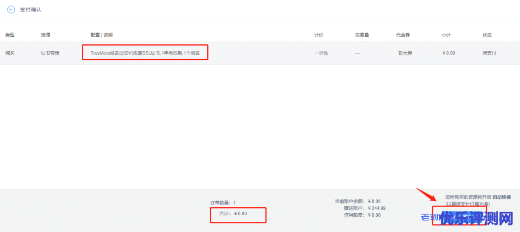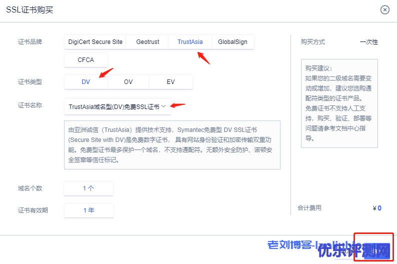 3,选择[购买证书]按钮,选定购买对应的免费证书:证书品牌TrustAsia,证书类型DV,证书名称TrustAsia域名型(DV)免费SSL证书。