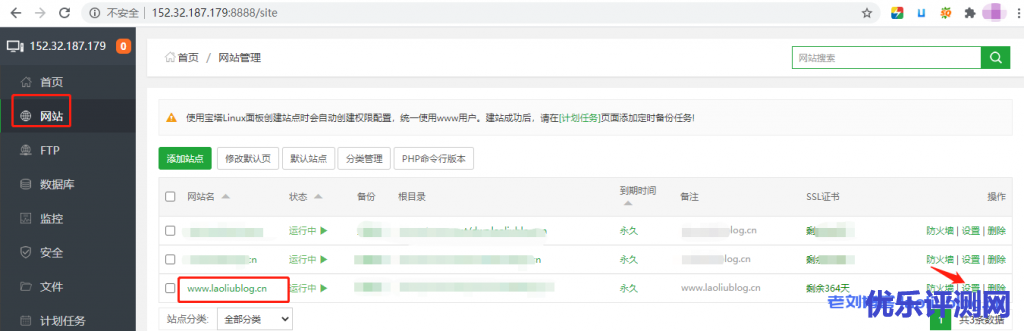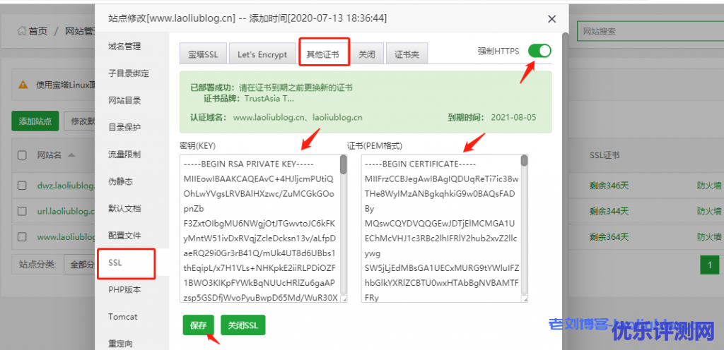 2,宝塔建站启用https:打开网站服务器宝塔面板后台,选择[网站],选择需要部署https的站点www.laoliublog.cn,选择[设置]。在SSL的其他证书里粘贴好对应的密钥(KEY)和证书(PEM格式),选择[保存],并强制HTTPS。