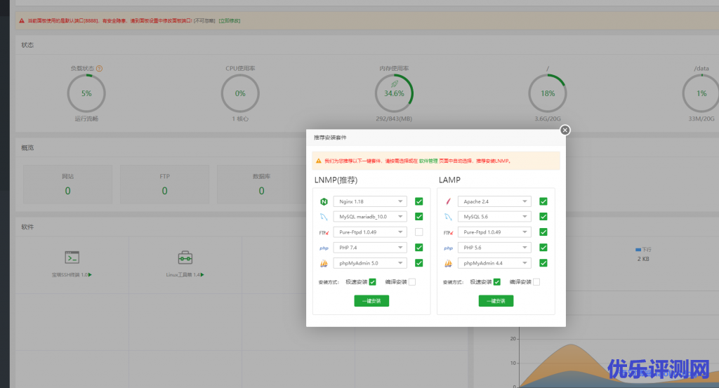 执行命令约3分钟安装完毕。下面配置小编常用网站环境Nginx1.18+PHP7.4+Mysqlmariadb_10.0+phpMyadmin 5.0,采用极速安装