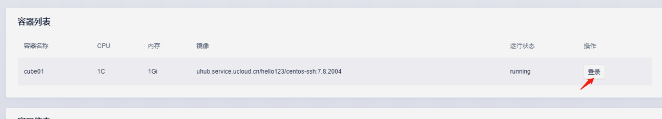 镜像没有默认初始密码,需要用户待容器运行状态变为running以后,在Cube容器组详情页面点击登录。