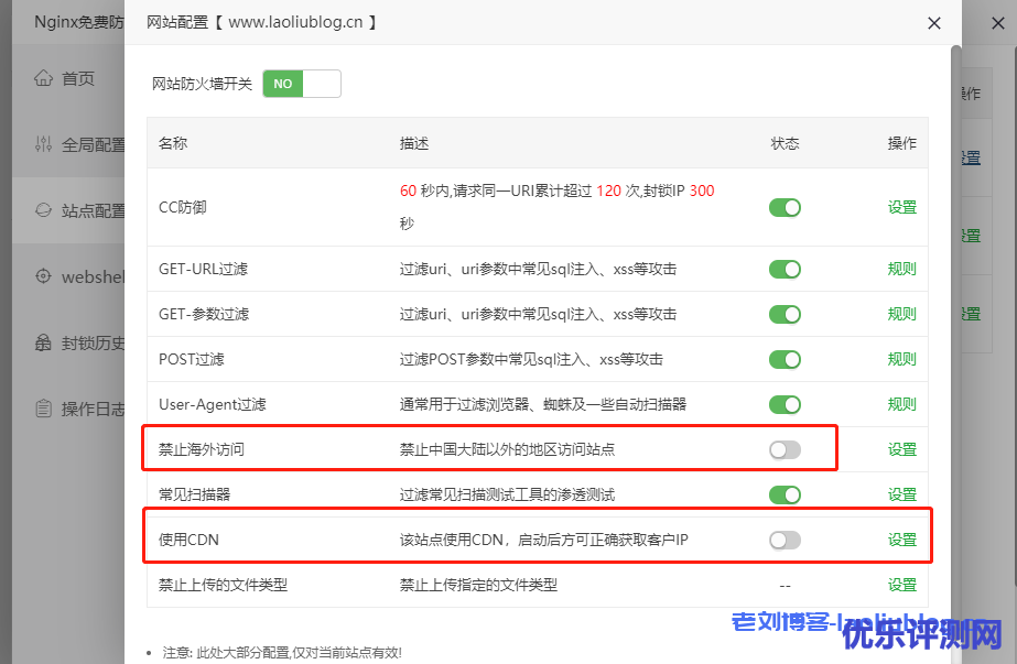 这里注意两点,一是是否禁止海外访问,这个由你的网站访客在哪里决定;二是如果你使用了CDN,就要启动下图中的项目,才能正确获取访客真实IP。使用cdn,不知道真实IP,这个问题也是困扰很多朋友的,之前老刘博客也有介绍过代码查询实现方法《网站使用CDN加速后,怎么查看用户访问的真实IP?》,这里使用Nginx免费防火墙就轻松解决了。