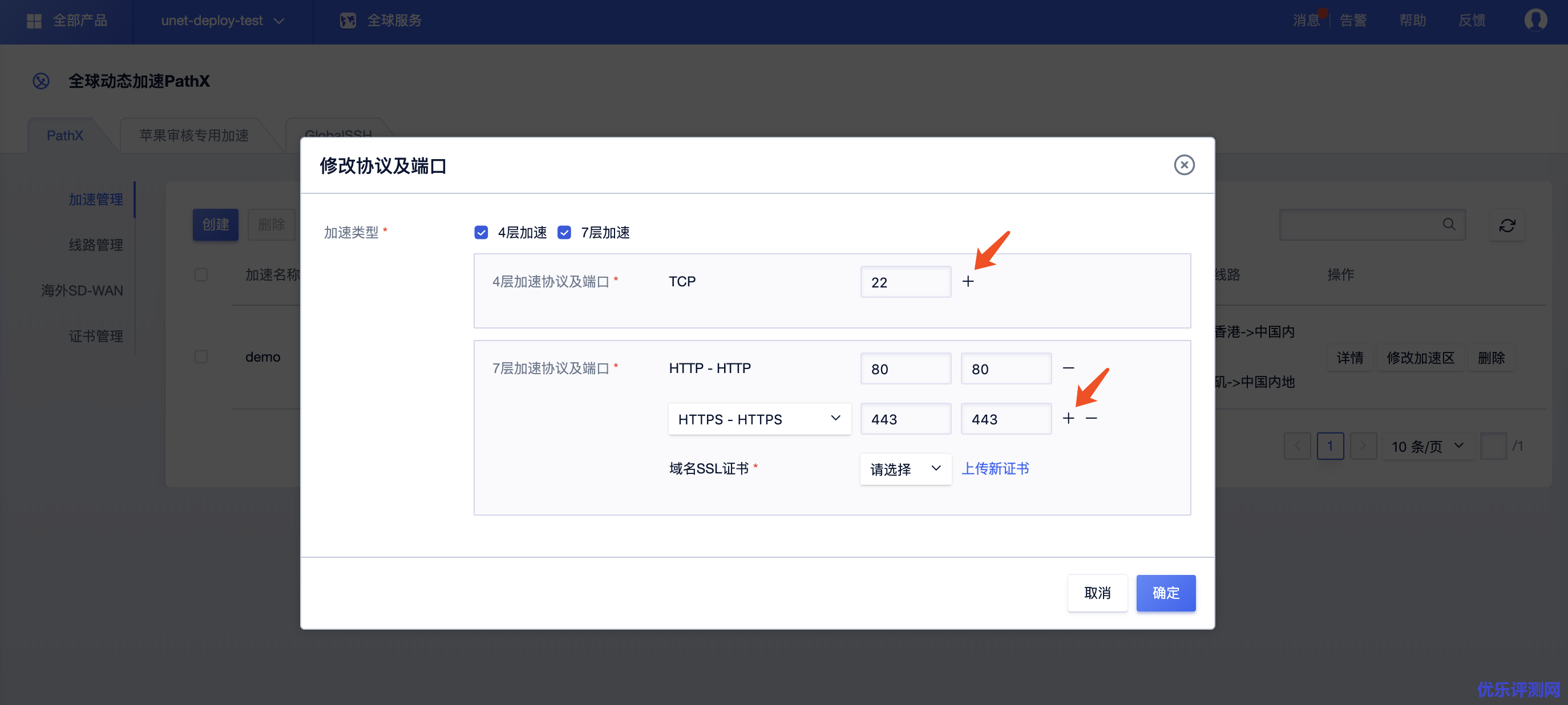 注意: 4层TCP协议端口和7层加速端口是不能重复的 且 4层+7层加速端口总数不能超过50个。