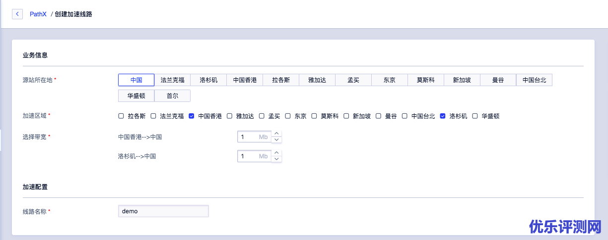 点击列表左上角的创建按钮 进入创建页面;源站选择中国,加速区域选择中国香港和洛杉矶,下方会出现两条线路,右侧显示当前带宽值,根据需要调整。购买加速线路成功后回到线路管理列表 会显示所有购买的线路数据。