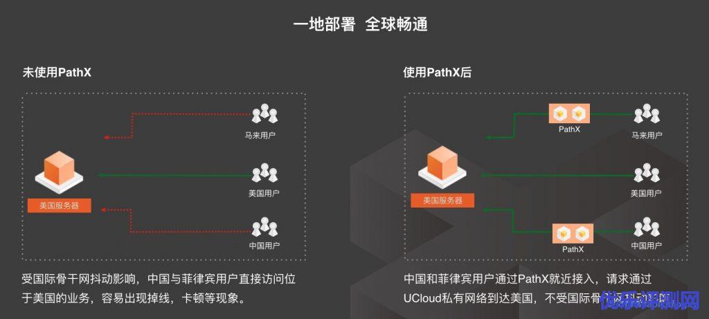 UCloud优刻得全球动态加速(PathX),是一款致力于提升应用在全球访问质量的网络加速产品。使用PathX后,借助于分布在全世界的转发集群,各地区用户可实现就近接入,并通过PathX将请求转发回源站,有效规避跨国网络拥塞导致的响应慢、丢包等问题。