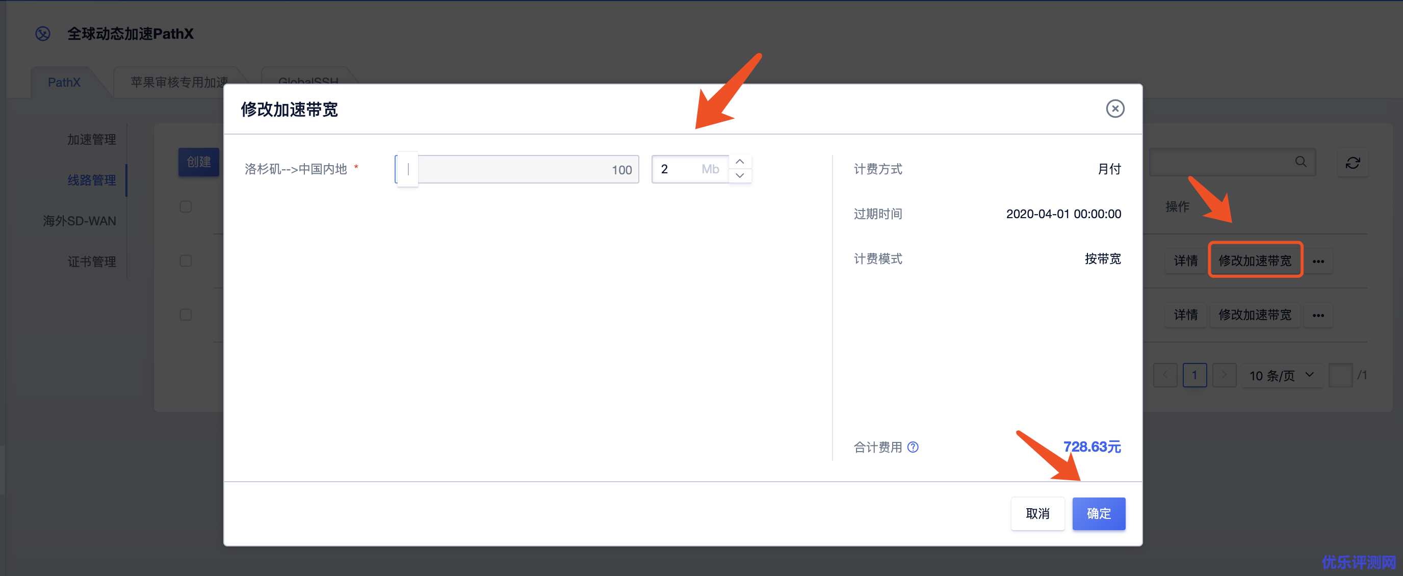 2)在线路管理列表,点击每行记录右侧的修改带宽按钮 弹出框内完成修改带宽。