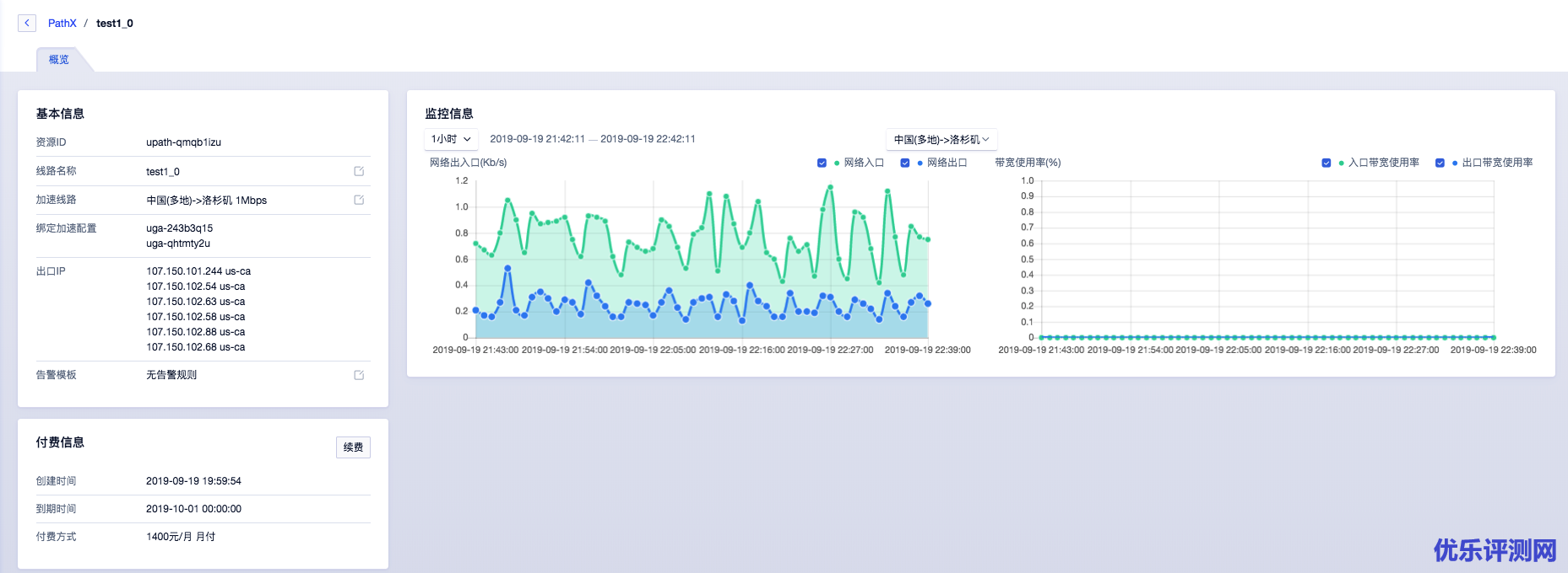 7)需要查阅监控数据、价格、线路出口、设置监控告警等信息,可以点击列表中每一行最右侧的详情按钮。加速线路实例详情页如下所示:
