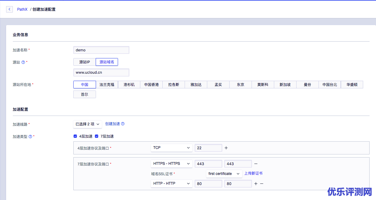 点击列表左上角的创建按钮, 进入创建配置页面,填写源站域名或源站IPwww.ucloud.cn,选择源站所在地 中国。此时加速线路下拉列表可以选择之前已经购买的线路(中国香港到中国和洛杉矶到中国)全部勾选。根据你的业务需要勾选4层和7层并设置端口号,选择HTTPS-HTTP或HTTPS-HTTPS协议需要绑定SSL证书。下拉列表中没有证书时,请点击上传新证书。