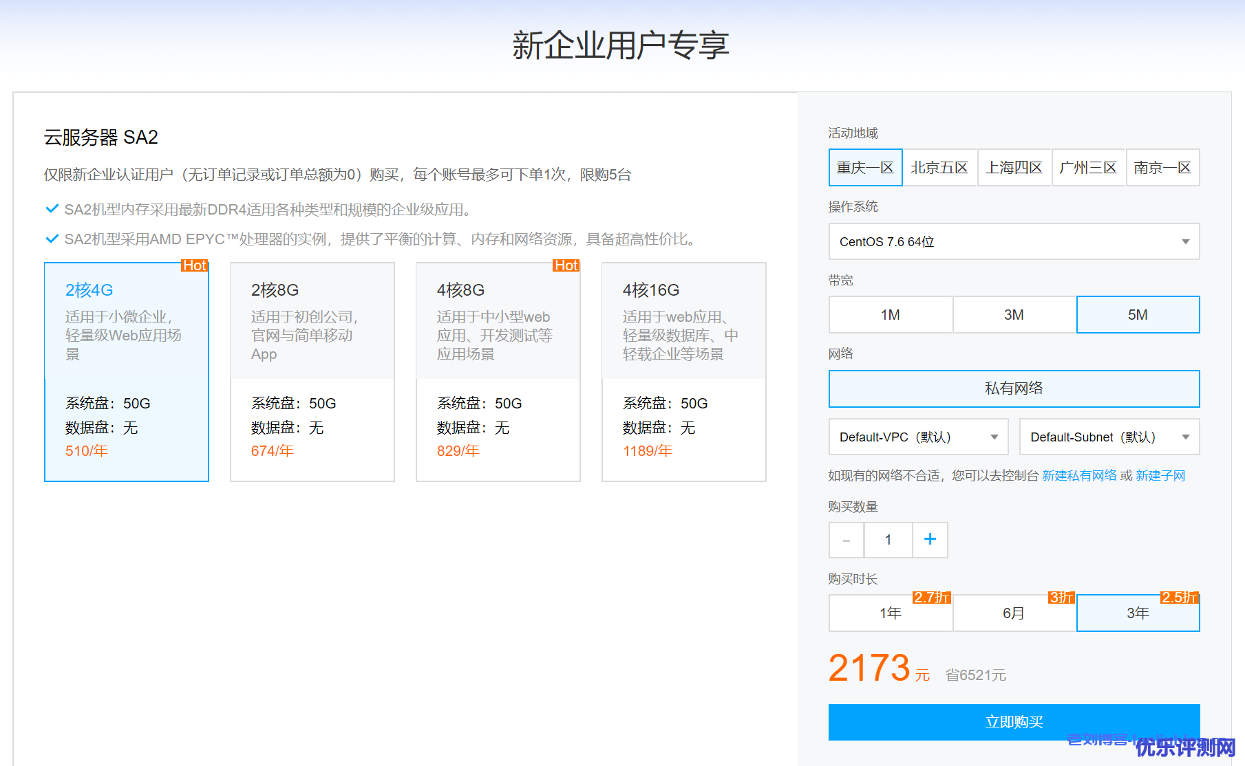 活动地域有重庆一区,北京五区,上海四区,广州三区和南京一区。操作系统有Centos,ubuntu和Windows。购买时长可选6个月,1年和3年,其中6个月是3折优惠,1年是2.6折优惠,3年是2.5折优惠。