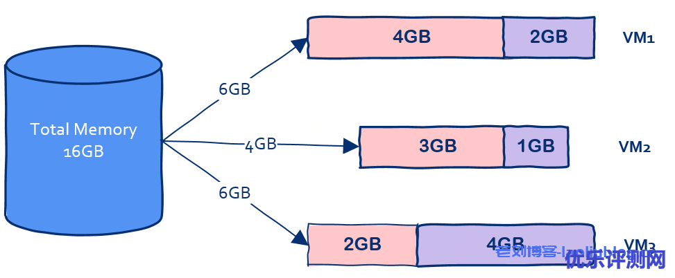 假设我有一台机器,16G内存,需要部署三个应用,那么使用虚拟机技术可以这样划分: