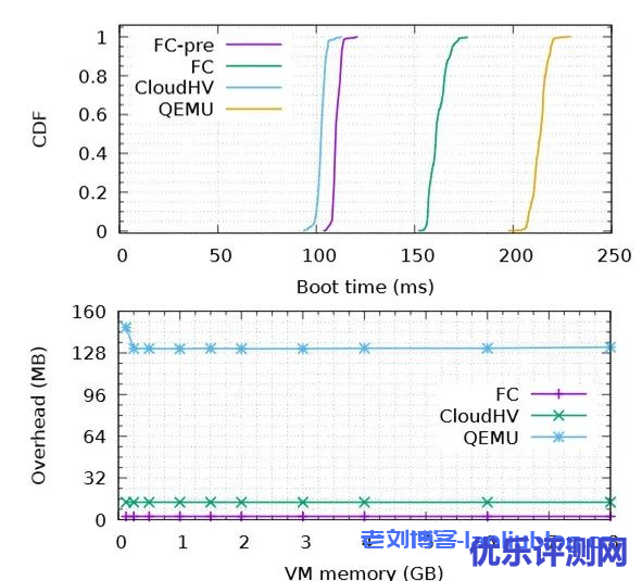 容器团队注意到AWS开源了轻量级虚拟机firecracker,具有资源占用少、启动速度快、易于维护等诸多优点,并已用于实际生产环境,非常符合Cube业务场景,因此最终采用了以firecracker轻量级虚拟机为基础的容器运行时方案。从下面两张图可以看出,通过对云计算场景特别的精简和优化,firecracker相对于目前主流的虚拟化组件qemu在启动速度和内存消耗方面有明显的优势。