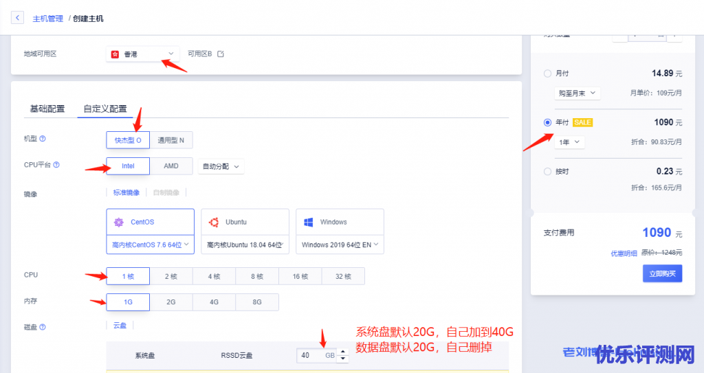 3,进到控制台创建主机,这里老刘选择香港可用区B机房。自定义配置:快杰型O,Intel,CentOS 7.6,1核,2G,40G系统盘(20G数据盘手动删去)。