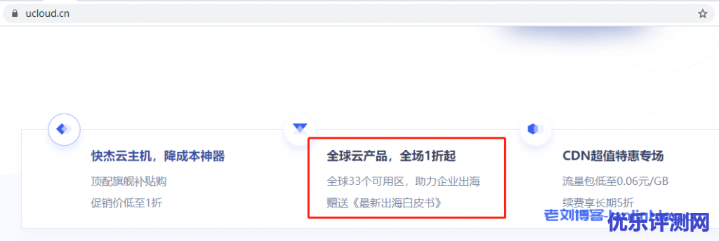 1,访问UCloud官网ucloud.cn注册UCloud账号,参照《UCloud账号注册实名认证及领券购买云主机图文教程》完成实名认证。账号登录状态下,如图选择UCloud官网首页第二个活动卡片:全球云产品,全场1折起。