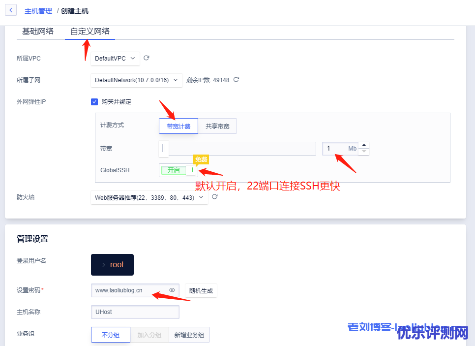 自定义网络:带宽计费2M,如果想流量计费找官网客服开通。这里由于我们买的是海外服务器,GlobalSSH默认免费开通的,帮助我们22端口连接SSH更快,具体GlobalSHH介绍参见《UCloud免费GlobalSSH产品跨国网络加速使用教程》。设置好服务器密码和名称,其他参数默认即可。防火墙记得选择带22端口的安全组。之后选择年付去购买即可。