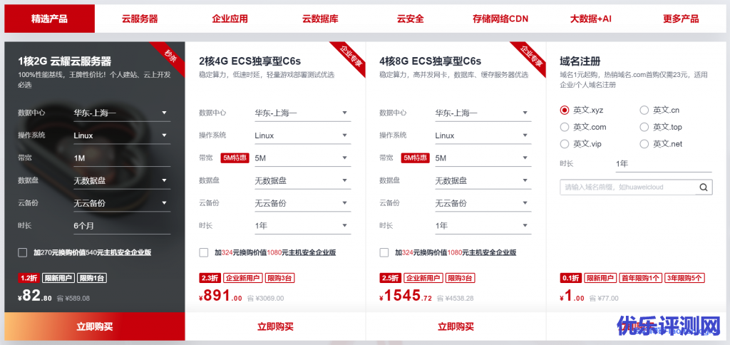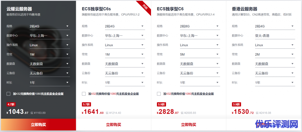 华为云828企业上云节特推出4款热销云服务器促销活动,新老用户同享,购买云服务器赠送主机安全基础版。云耀云服务器,极致性价比适用于均衡场景;ECS独享型C6s,旗舰级性能适用于高负载场景,CPU内存比1:2;ECS独享型C6,旗舰级性能适用于高负载场景,CPU内存比1:4;香港云服务器,通用计算型S3,CN2高速带宽,高稳定、低时延。具体配置见下: