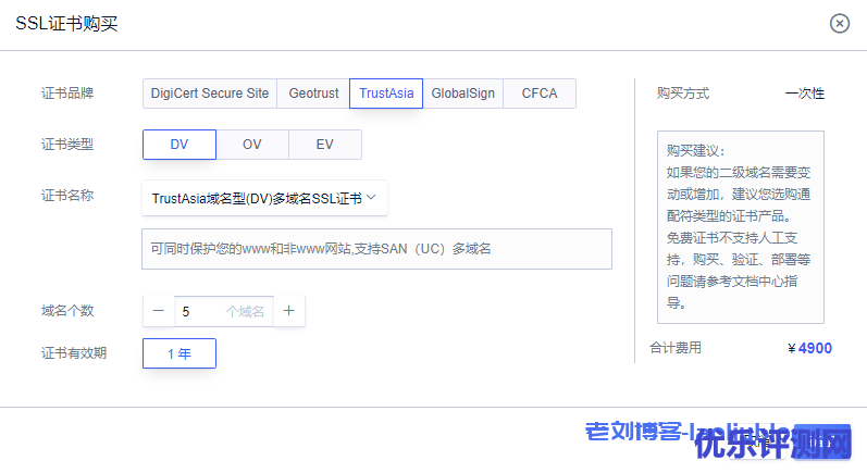 老刘博客这里推荐使用UCloud优刻得云厂商的多域名型SSL证书,传送门>>