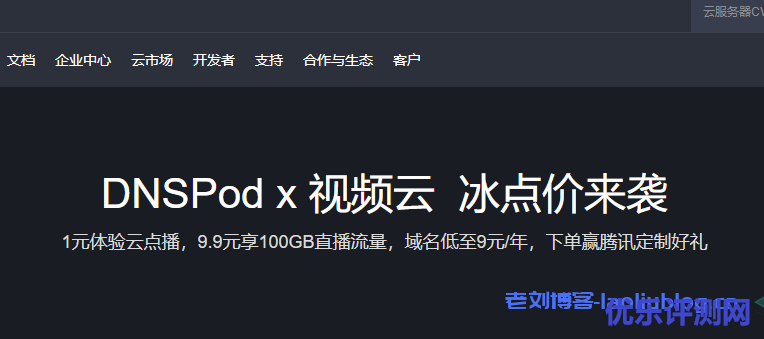 老刘今天留意到腾讯云推出了DNSPod x 视频云 冰点价来袭活动:腾讯云1元体验云点播,9.9元享100GB直播流量,域名低至9元/年,下单赢腾讯定制好礼,活动时间:2020年9月7日-2020年12月31日。腾讯云官网已注册且完成实名认证的国内站用户均可参与(协作者、大客户除外)。