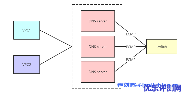 UCloud内网DNS集群,采用BGP+ECMP实现高可用及高扩展性。架构如下图: