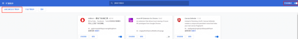 2、打开chrome浏览器 ->选项->更多工具->扩展程序,或者在地址栏输入 chrome://extensions/,先开启开发者模式,再加载已解压的扩展程序,见下图