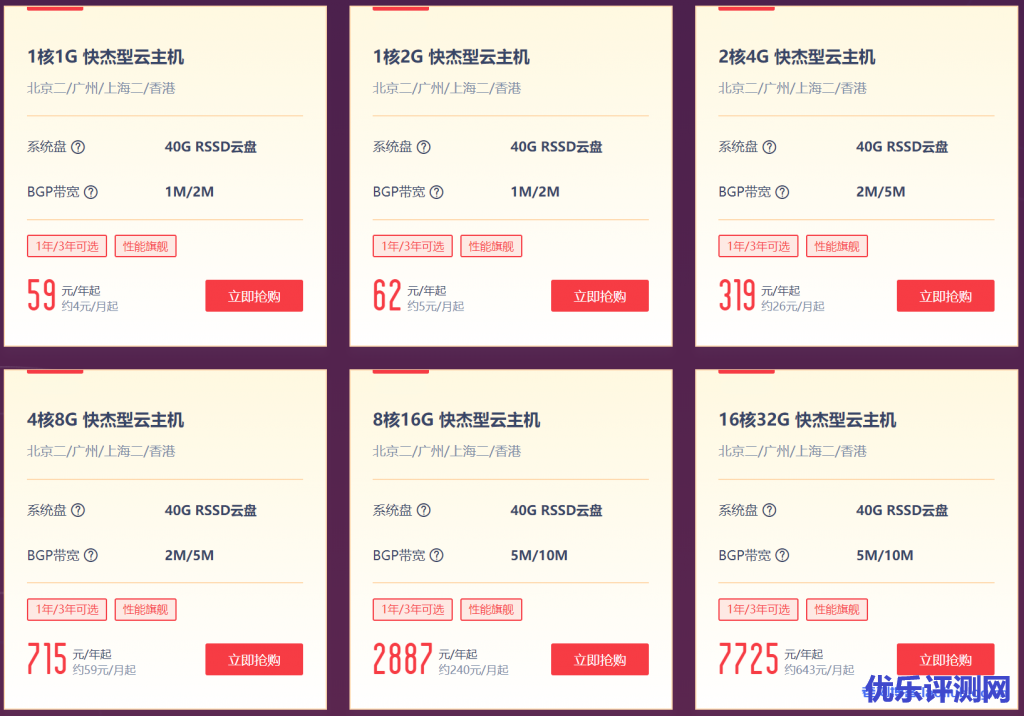 上云补贴首购促销的快杰型云主机地域可选北京二/广州/上海二/香港可用区,配置可选1核1G(BGP带宽可选1M或2M),1核2G(BGP带宽可选1M或2M),2核4G(BGP带宽可选2M或5M),4核8G(BGP带宽可选2M或5M),8核16G(BGP带宽可选5M或10M)和16核32G(BGP带宽可选5M或10M),时长可选1年或3年,系统盘是40G RSSD云盘(系统盘在UCloud控制台默认20G,可免费升级至40G)。