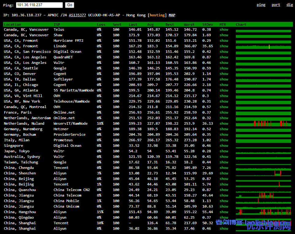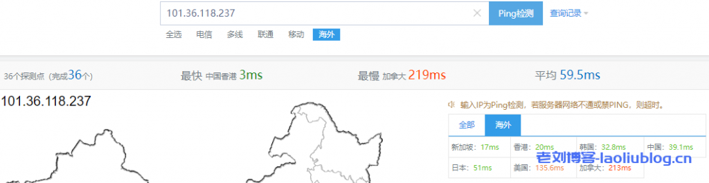 此外也测试了海外节点网络延时情况,具体如下图: