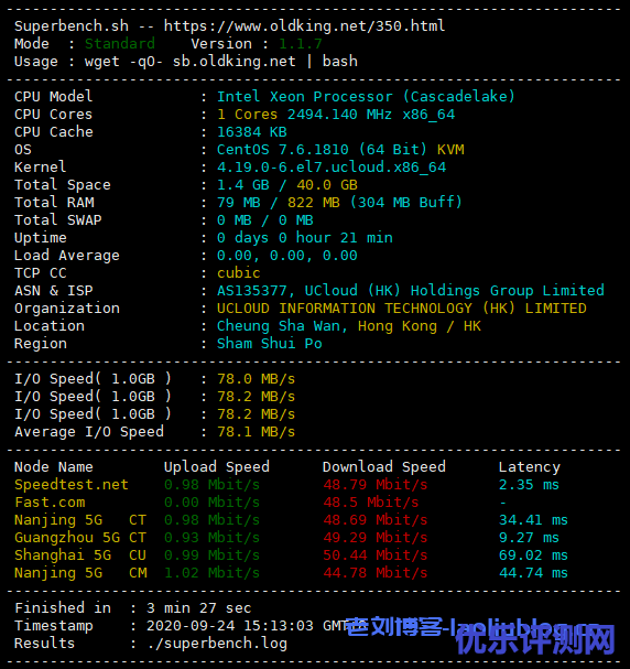 前文《评测UCloud年度大促首年60元1C1G1M北京快杰云主机性能》,老刘博客测试了UCloud年度大促国内机房北京快杰云主机性能,那有朋友问这次活动推出的香港快杰云主机性能如何呢?今天老刘就拿此次UCloud促销活动中企业用户首年120元3年360元(个人用户首年126元3年378元),基础配置1核1G内存1M BGP带宽40G系统盘香港快杰云主机做下性能测评以供大家参考。