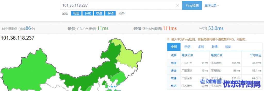 使用站长之家ping工具测试了国内三网网络连通性,延时最低11ms,均值53ms,真的是低延时啊。
