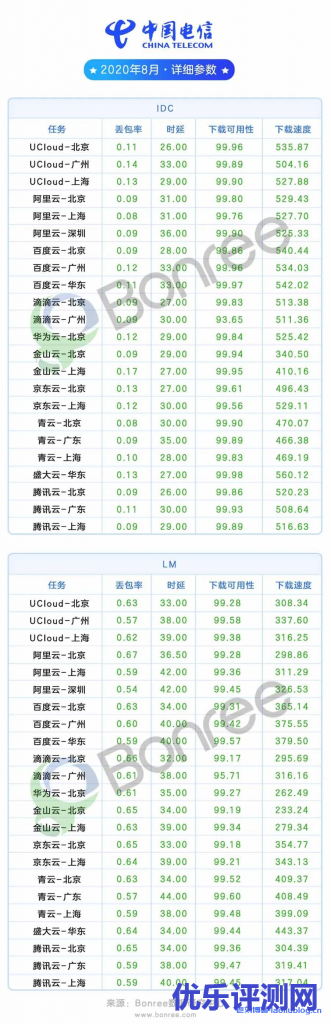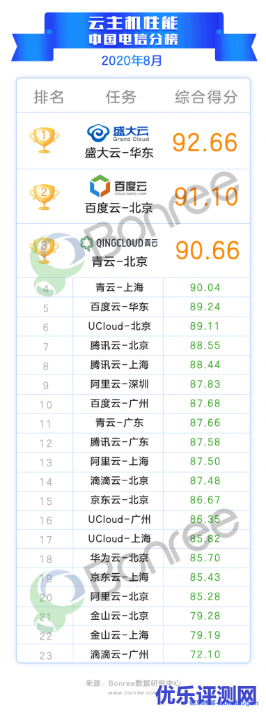此榜主要反应在中国电信运营商覆盖下,各云平台在网络稳定和传输质量上的表现。