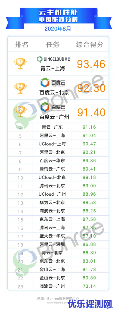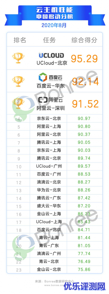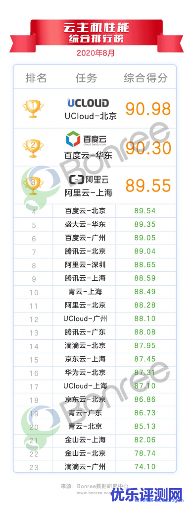 在2020年8月云主机性能综合排行榜中,UCloud-北京位居榜首,百度云-华东和阿里云-上海分列第二、三名。