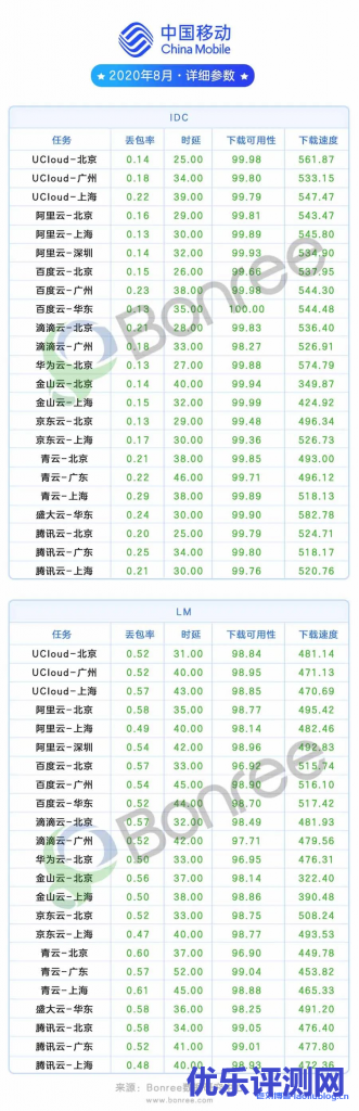 此榜主要反应在中国移动运营商覆盖下,各云平台在网络稳定和传输质量上的表现。